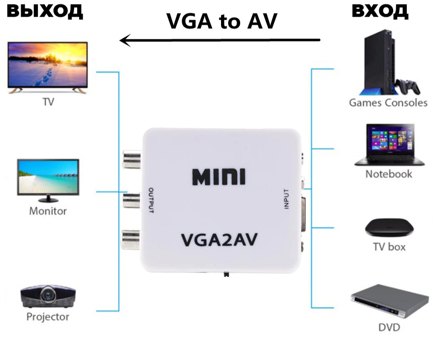 Примечание: Этот конвертер однонаправленный. Он преобразует только из VGA в AV