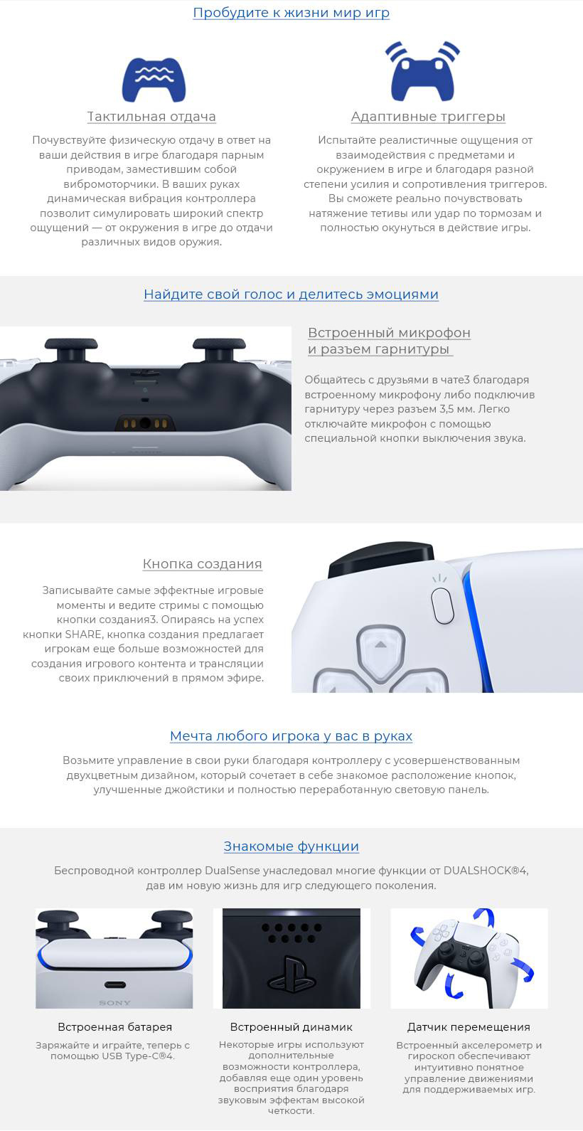 Откройте для себя волнующий мир захватывающих и реалистичных игр с новым контроллером для PS5, который поддерживает тактильную отдачу и динамический триггерный эффект. Беспроводной контроллер DualSense также оснащен встроенным микрофоном и кнопкой CREATE для создания контента — и все это вы получаете в невероятно эргономичном корпусе.