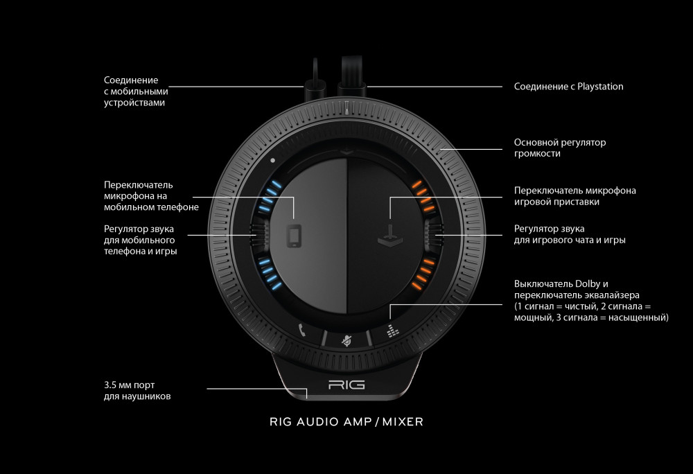 - Усилитель аудио позволяет легко управлять уровнем громкости звукового сопровождения игры и голосового чата, а также объединять их с музыкой или вызовами с мобильного устройства.