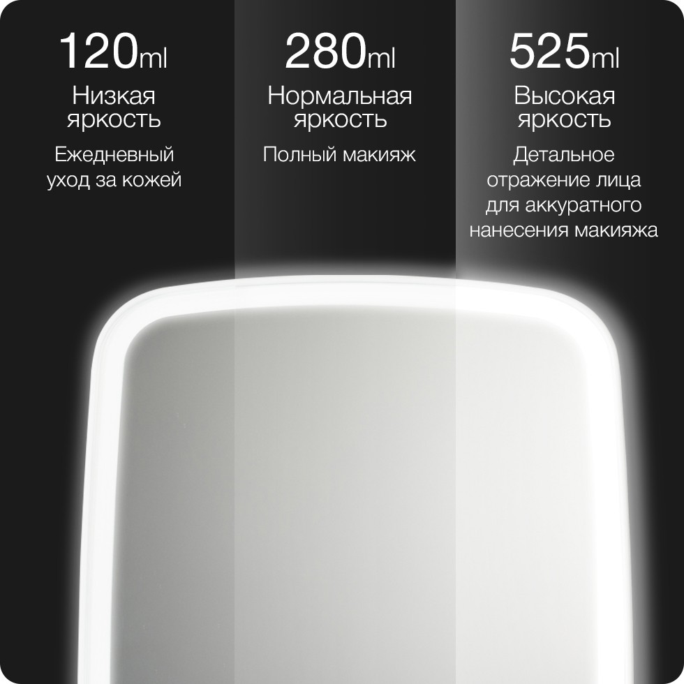 Зеркало работает без проводов от литиевого аккумулятора емкостью 1200 мАч, обеспечивающего продолжительный срок автономной работы. С таким зеркалом Вы сможете устроить персональную гримерку в любом помещении.