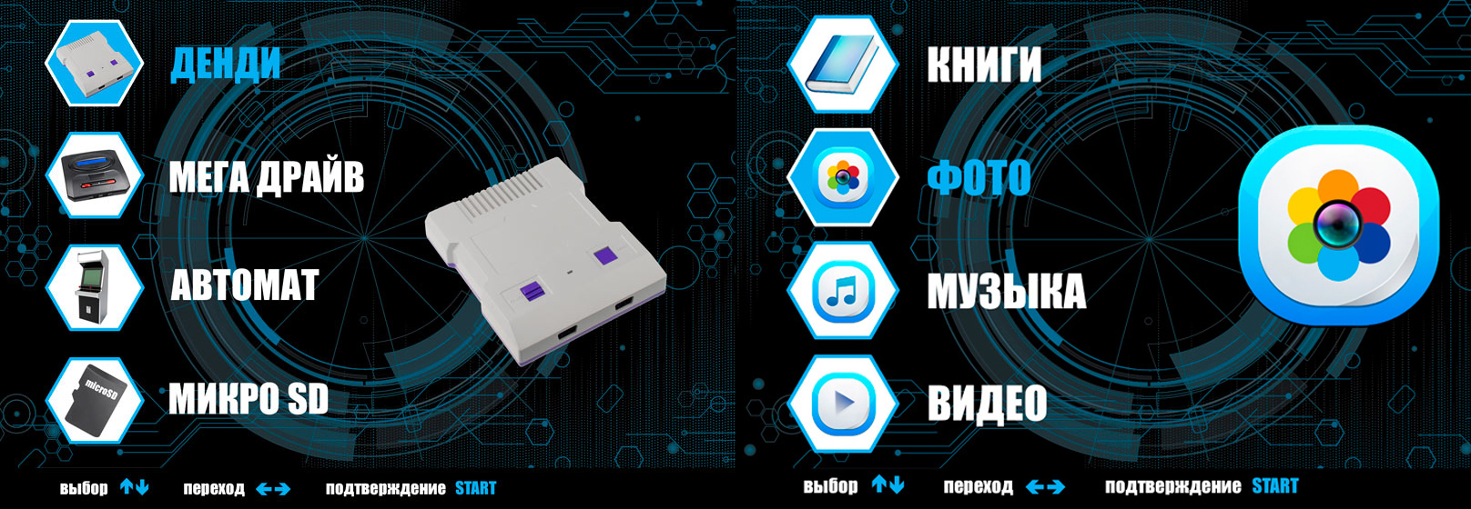 Игровая часть меню состоит из разделов 8- и 16-битных игр, а также игр МАМЕ (АВТОМАТ) , microSD с доступом к карте памяти.