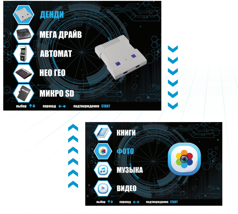 Игровая часть меню состоит из разделов 8- и 16-битных игр, а также игр МАМЕ (АВТОМАТ), Neo-Geo (SNK) и МИКРО SD с доступом к карте памяти.