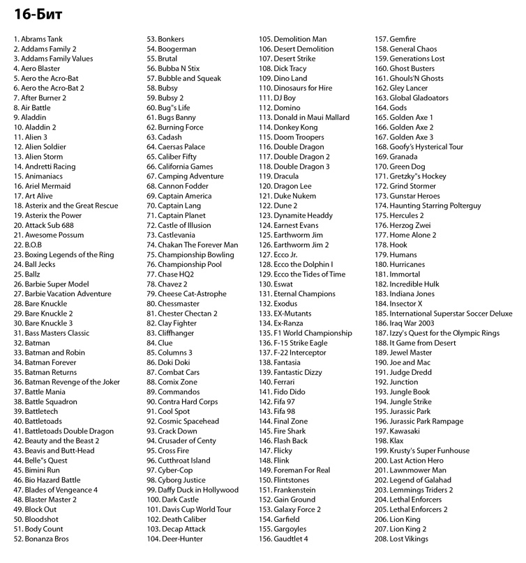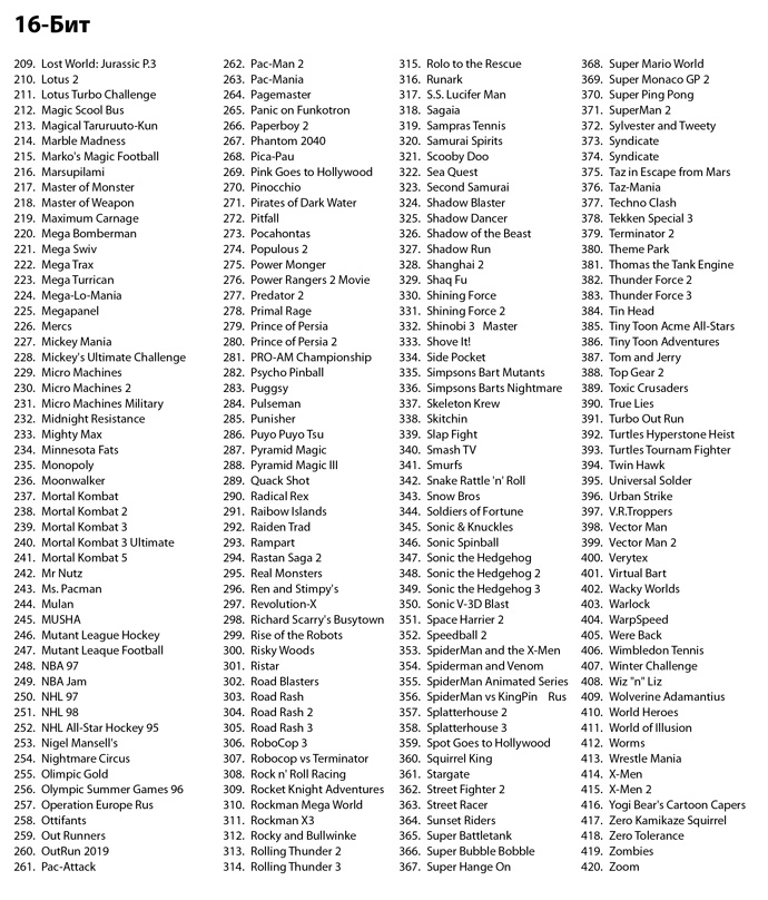 В сборник вошли 420 самых известных игр с платформы SEGA 16-бит. Всё, о чем только могут мечтать поклонники видеоигр всех возрастов: серия захватывающих файтингов, многоуровневые приключения самых известных мультипликационных героев, стратегии, логика, спорт и захватывающие гонки.