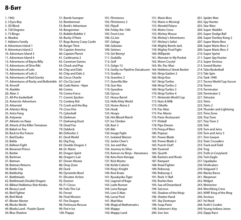 В сборник вошли 250 самых популярных игр с платформы Денди 8-бит. Захватывающие танковые сражения в Battle City, приключения итальянского водопроводчика Марио, динамичные Чип и Дейл, легендарные черепашки и боевые жабы, всевозможные вариации тетрисов, бродилки, стрелялки и многое-многое другое.