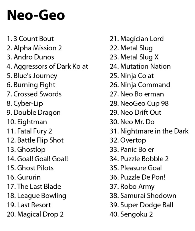 Neo-Geo — игровая система, созданная японской компанией SNK в 1989 году. Больше всего она была известна как система для игровых автоматов, а также выпускалась как отдельная игровая приставка. Игры для Neo-Geo отличаются высококачественными звуковым сопровождением и 2D-графикой. В память игровой приставки встроены 40 игр формата Neo-Geo.
