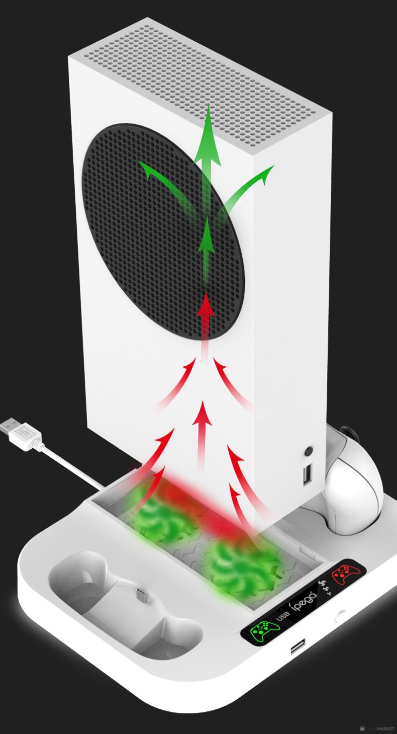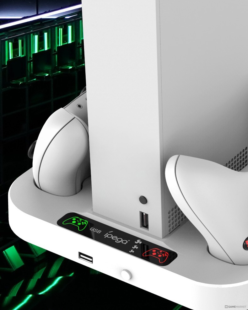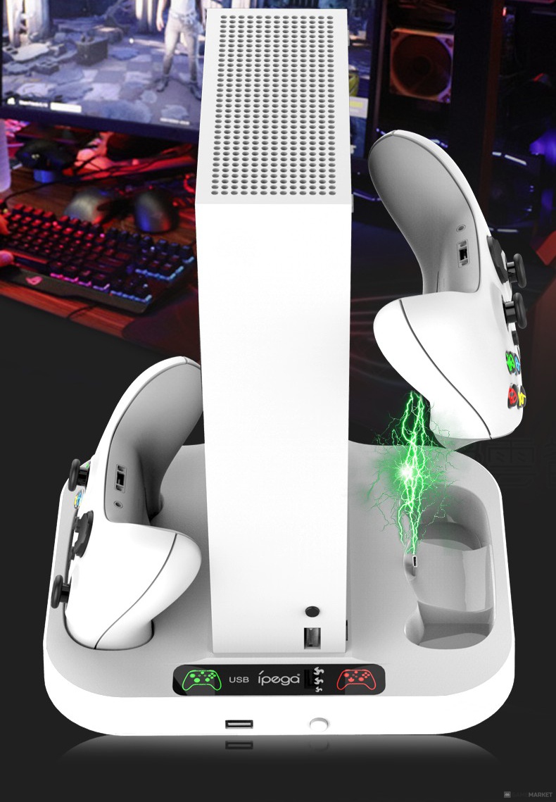 Подставка для XBOX Series S с зарядной станцией для геймпадов iPega PG-XBS012 – это возможность играть в режиме нон-стоп без необходимости прерываться из-за разряженных геймпадов или опасений за перегрев консоли. Два встроенных вентилятора, зарядная станция для двух геймпадов со светодиодной индикацией статуса зарядки + два аккумулятора (1400 мАч каждый).