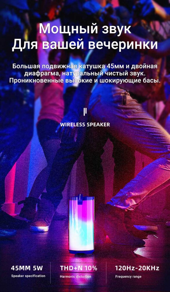 - Спикер: 45 мм. 4Ω5W*2 THD + N 10%.