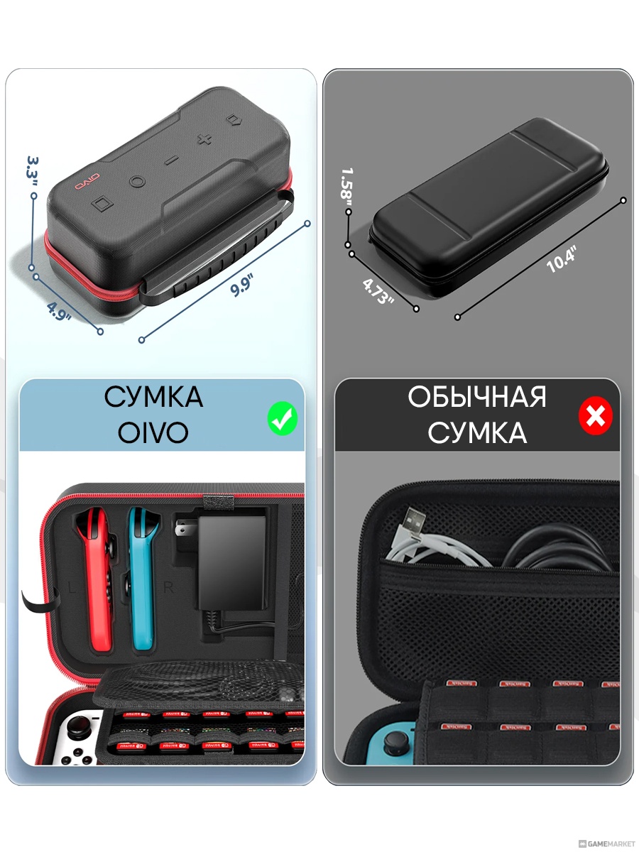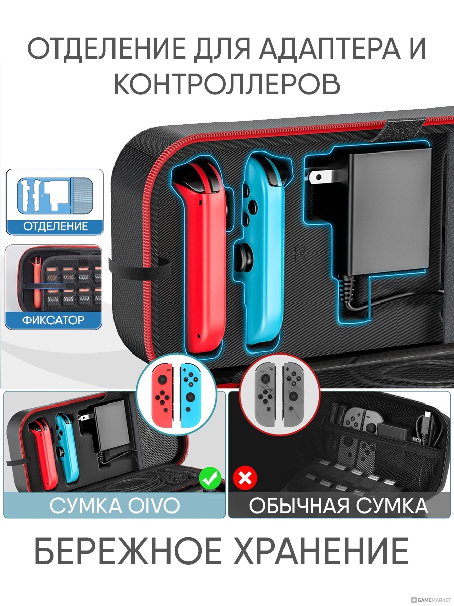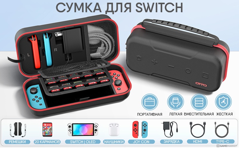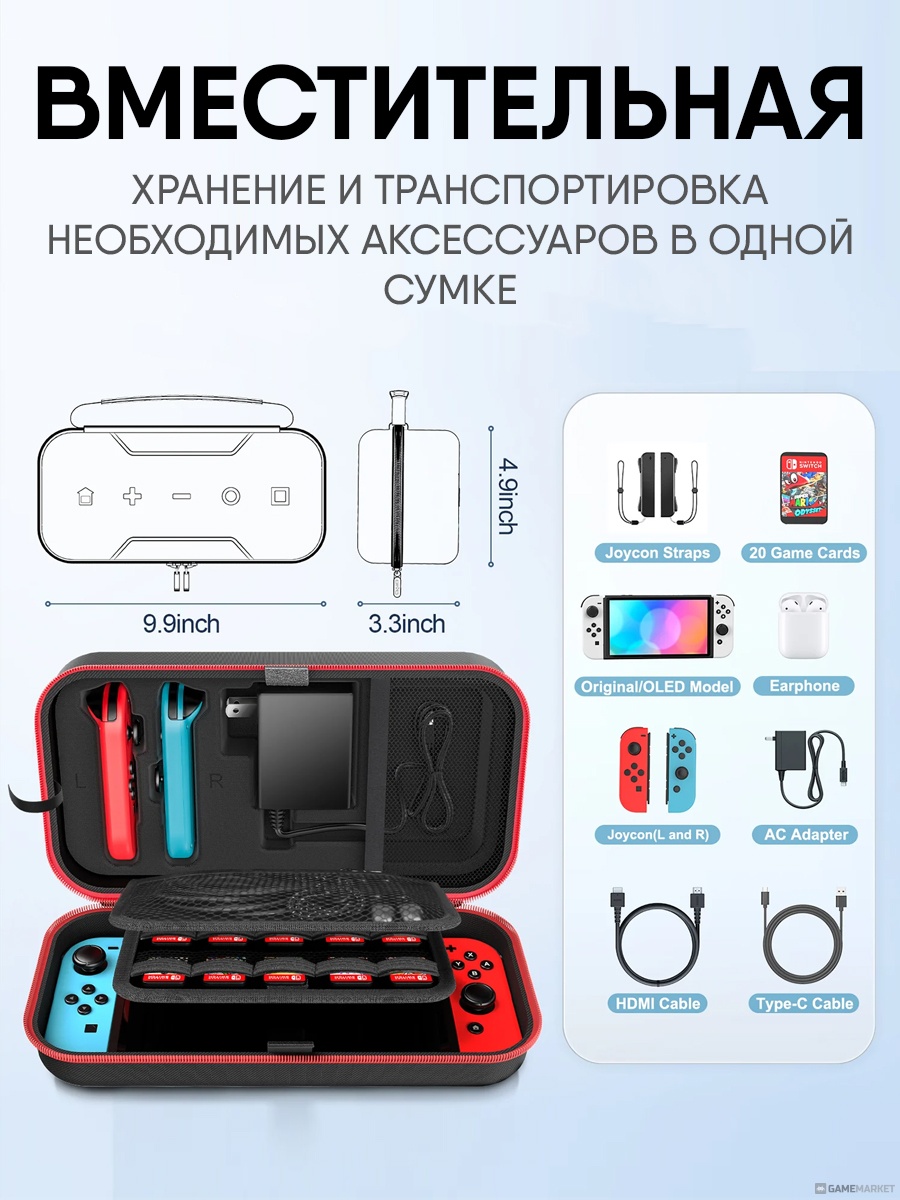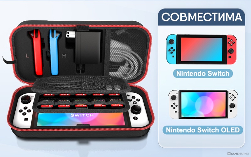 Ее компактный размер позволяет легко ее транспортировать, а вместительность гарантирует, что вы сможете взять с собой все необходимое: консоль, джойконы, зарядное устройство и даже дополнительные игры.