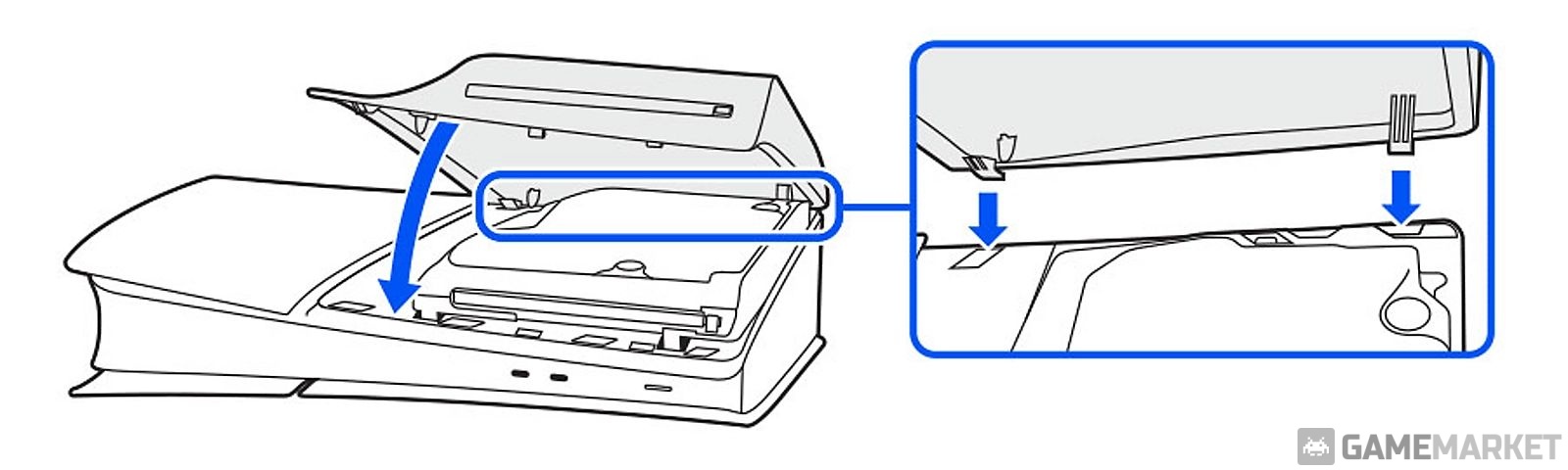 - Шаг 6: Прикрепите крышку и ножки горизонтальной подставки (длинные), входящие в комплект поставки дисковода. Совместите зажимы крышки с соответствующими отверстиями на консоли и нажмите на них до щелчка.