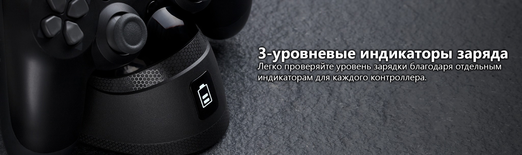 У вас всегда будет второй контроллер, готовый к продолжительным геймерским сессиям или многопользовательским играм. Подключите контроллеры PS4 к порту EXT и полностью зарядите их всего за два часа. ChargePlay Duo воплощает в себе исключительное удобство использования благодаря простой и надежной защелкивающейся конструкции зарядной станции и 3-уровневым индикаторам заряда аккумулятора. HyperX ChargePlay Duo поставляется с двухлетней гарантией и бесплатной технической поддержкой.